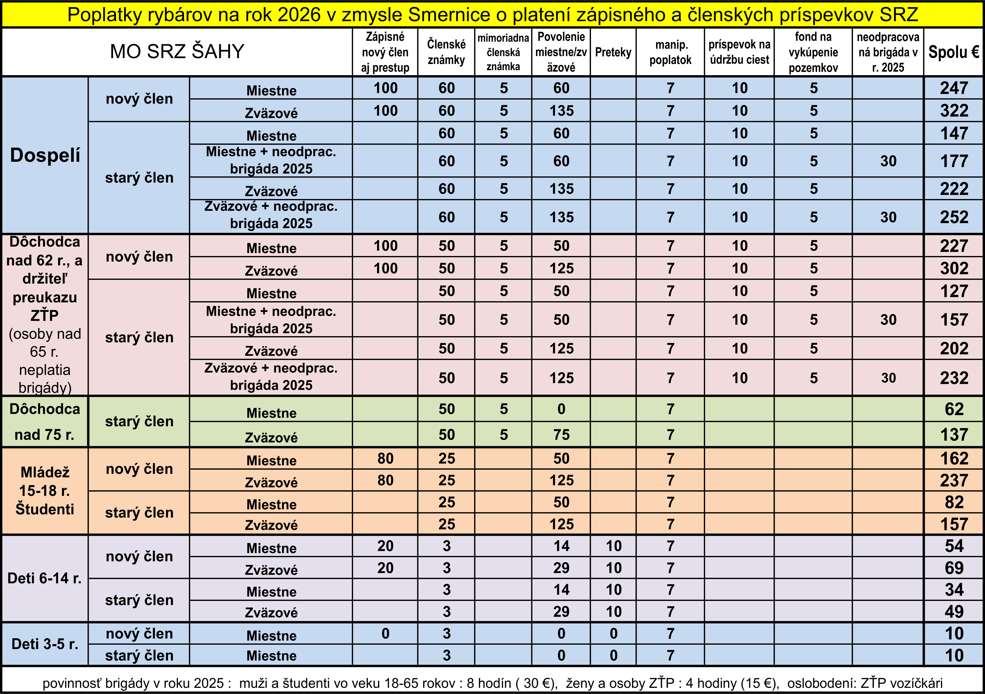 Prosíme tých rybárov, ktorí mali povinnosť zúčastniť sa brigády v roku 2025 (dospelí) a tak neurobili, aby hneď prirátali k cene 30 €- (18 až 65 rokov muži) a 15 € - ženy a ZŤP osoby (rovnaký vek ako muži) na základe rozhodnutia členskej schôdze podľa priloženej tabuľky (ceny povolení). Oslobodení od poplatkov sú len držitelia ZŤP - vozíčkari. Ďalšie poštové peňažné poukazy budú v rybárskom dome pri výdaji povolení,ako aj v rybárskom obchode pani Vargovej.