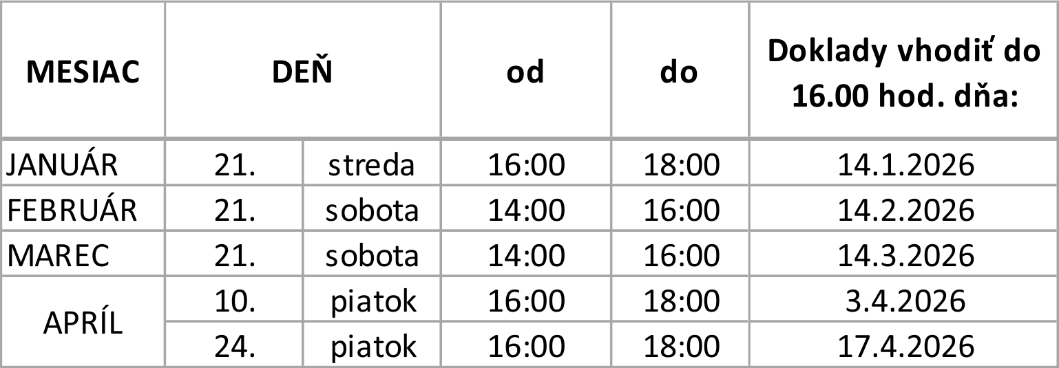 Doklady (vymenované vyššie) pre výdaj povolení je potrebné vhodiť do otvoru dverí podľa tabuľky do 16.00 hod. týždeň pred plánovaným výdajom v zalepenej obálke.